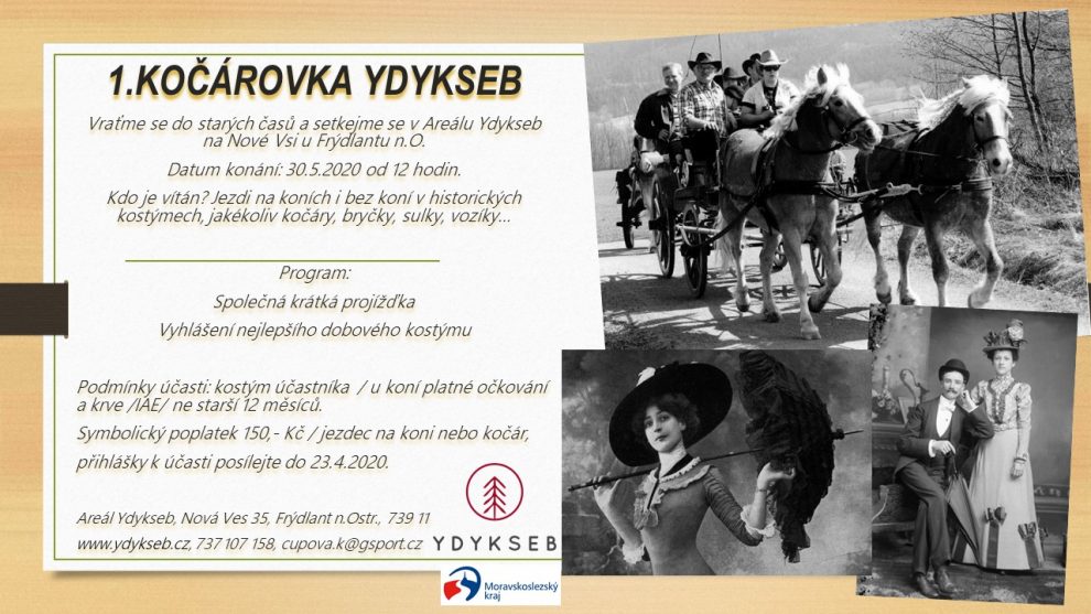 1.KOČÁROVKA YDYKSEB   Vraťme se do starých časů a setkejme se v Areálu Ydykseb na Nové Vsi u Frýdlantu n.O. Datum konání: 30.5.2020 od 12 hodin. Kdo je vítán? Jezdi na koních i bez koní v historických kostýmech, jakékoliv kočáry, bryčky, sulky, vozíky…  Program: Společná krátká projížďka Vyhlášení nejlepšího dobového kostýmu Podmínky účasti: kostým účastníka …
